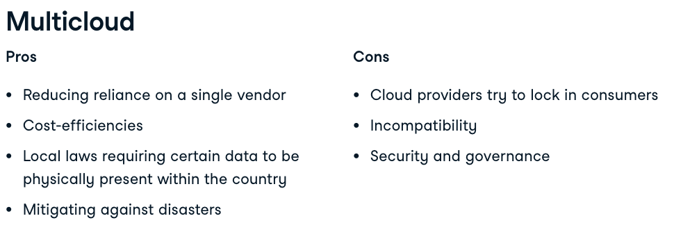 → Multicloud increases security and governanve concerns. You need to pay attention to the vulnerabilities of three providers instead of one. You also need to manage the availability, usability, integrity and security of the data not only over different services, but also over different platforms.